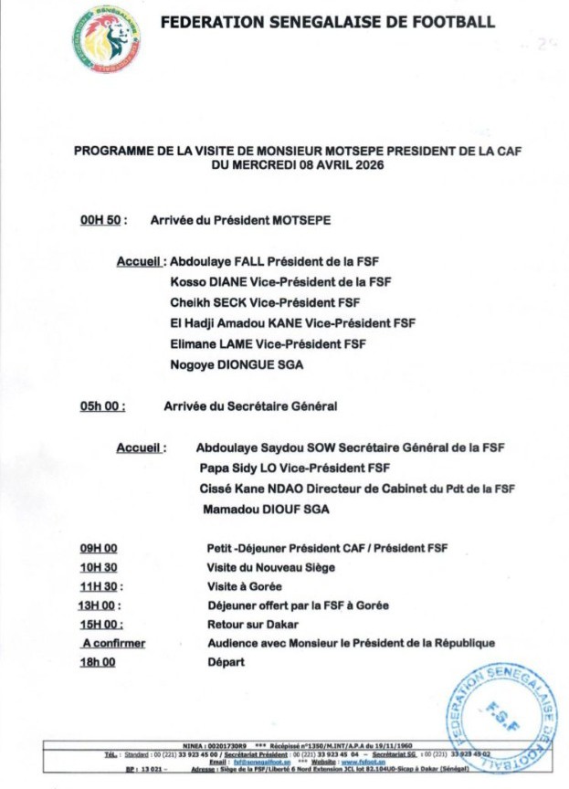 Programme Officiel de la Visite de Patrice Motsepe, Président de la CAF Mercredi 8 Avril 2026