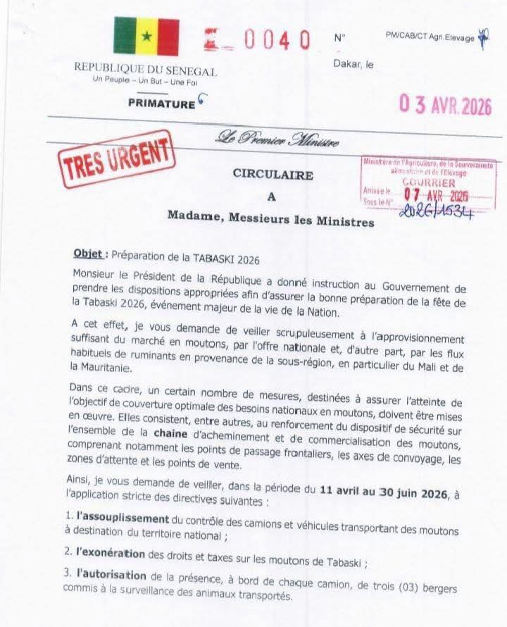 Dans le cadre des préparatifs de la Tabaski 2026, le Premier ministre Ousmane Sonko a décidé d’exonérer les taxes appliquées aux transporteurs de moutons et d’assouplir les contrôles routiers.