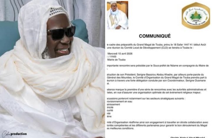 La première réunion préparatoire du Grand Magal de Touba se tiendra ce mercredi 15 avril 2026 à la mairie de Touba, dans le cadre d’une rencontre du Comité Local de Développement (CLD).