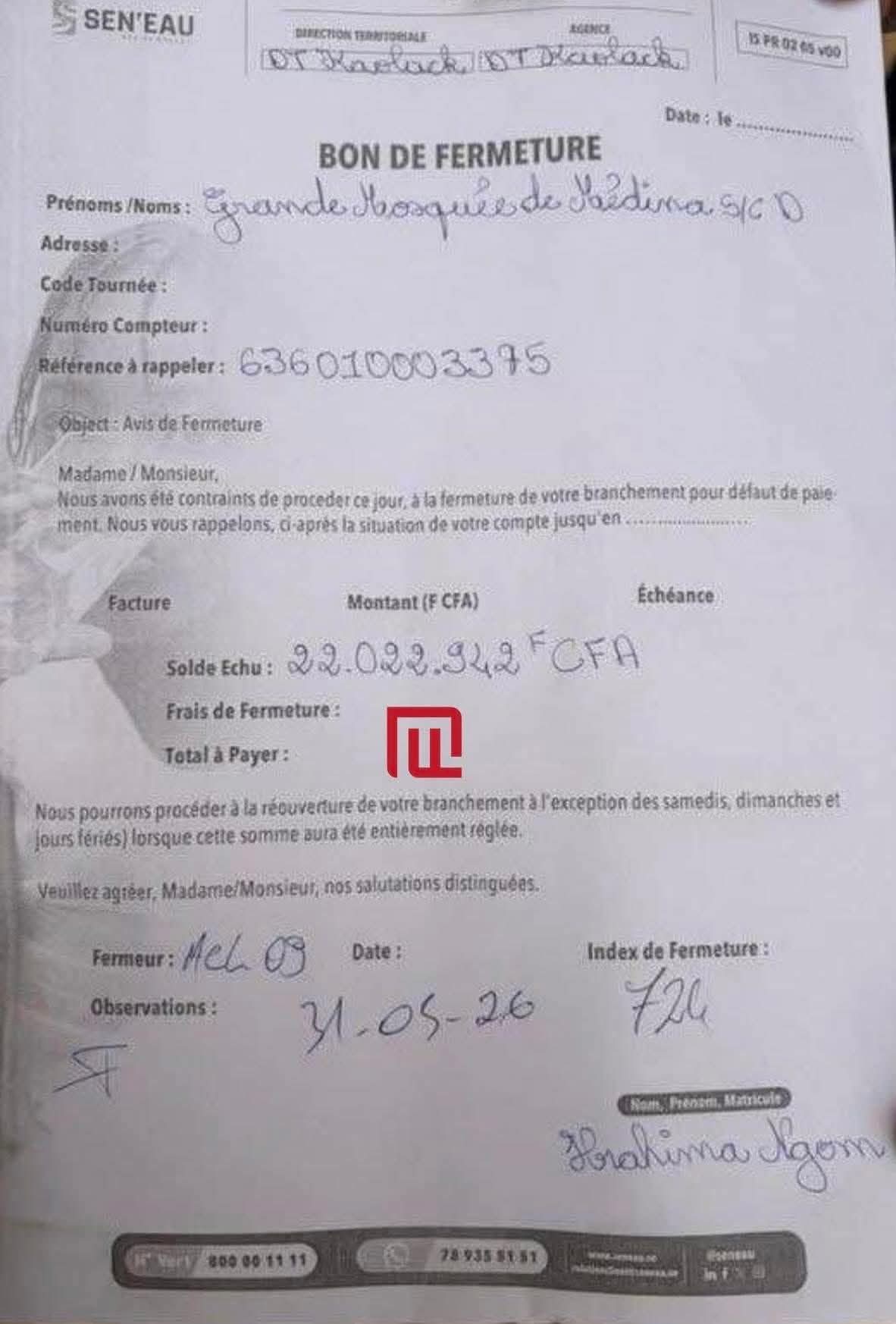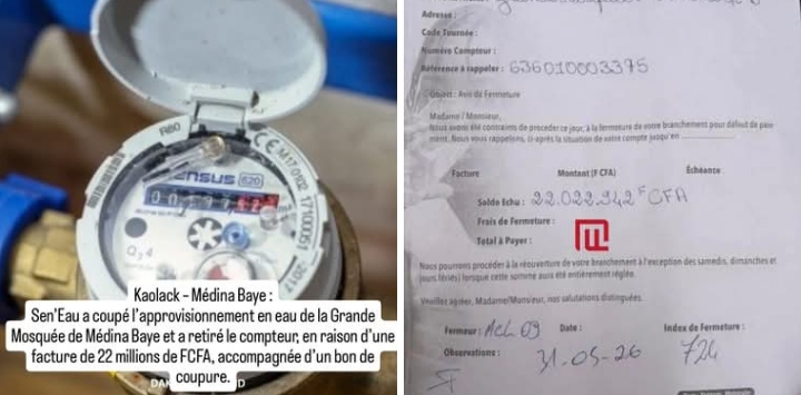 Selon les informations, cette décision fait suite à une facture impayée estimée à 22 millions de FCFA. L’intervention s’est également accompagnée du retrait du compteur, conformément à un bon de coupure établi à cet effet.