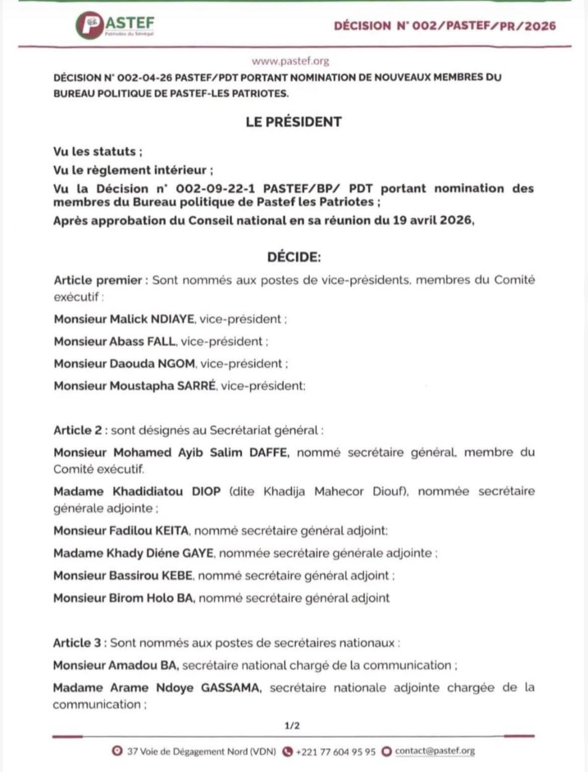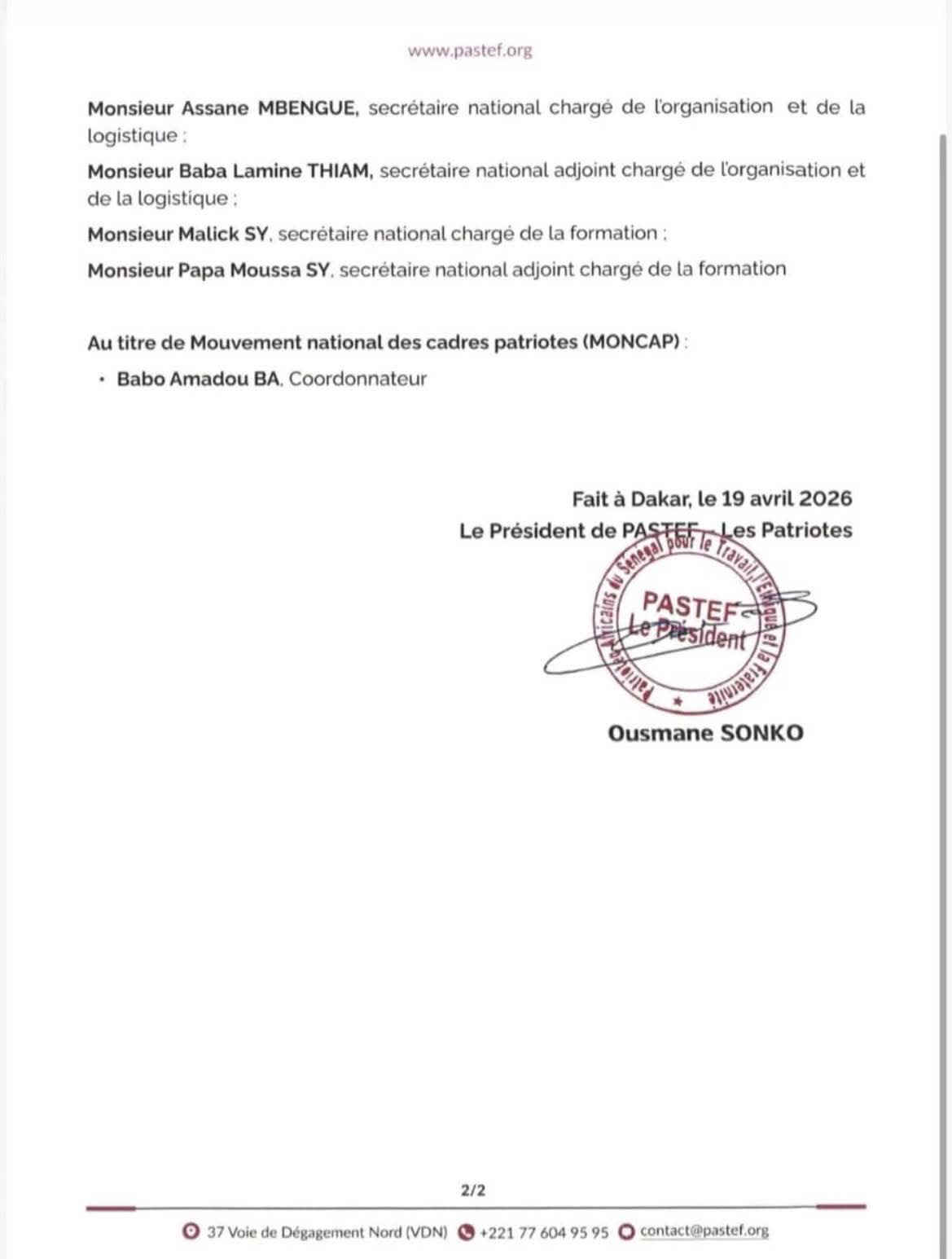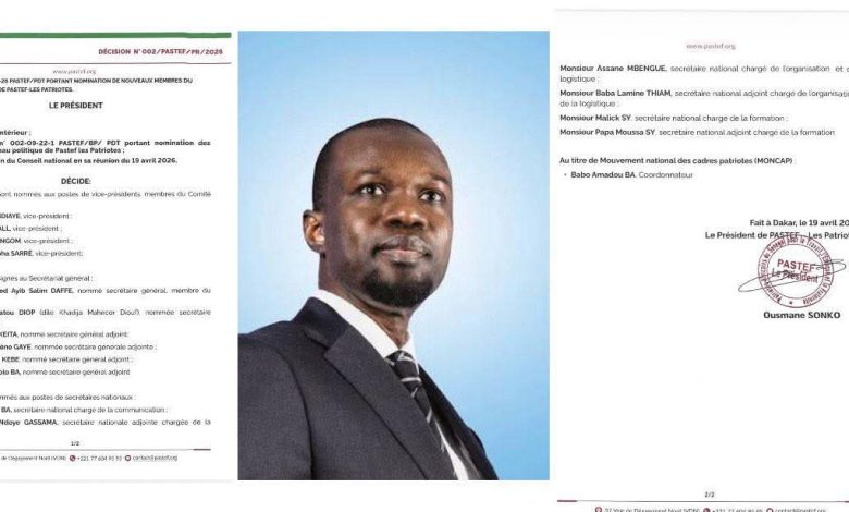 Le leader du Pastef, Ousmane Sonko a procédé à un remaniement du Bureau politique le 19 avril 2026, à l’issue d’une décision validée par le Conseil national du parti.